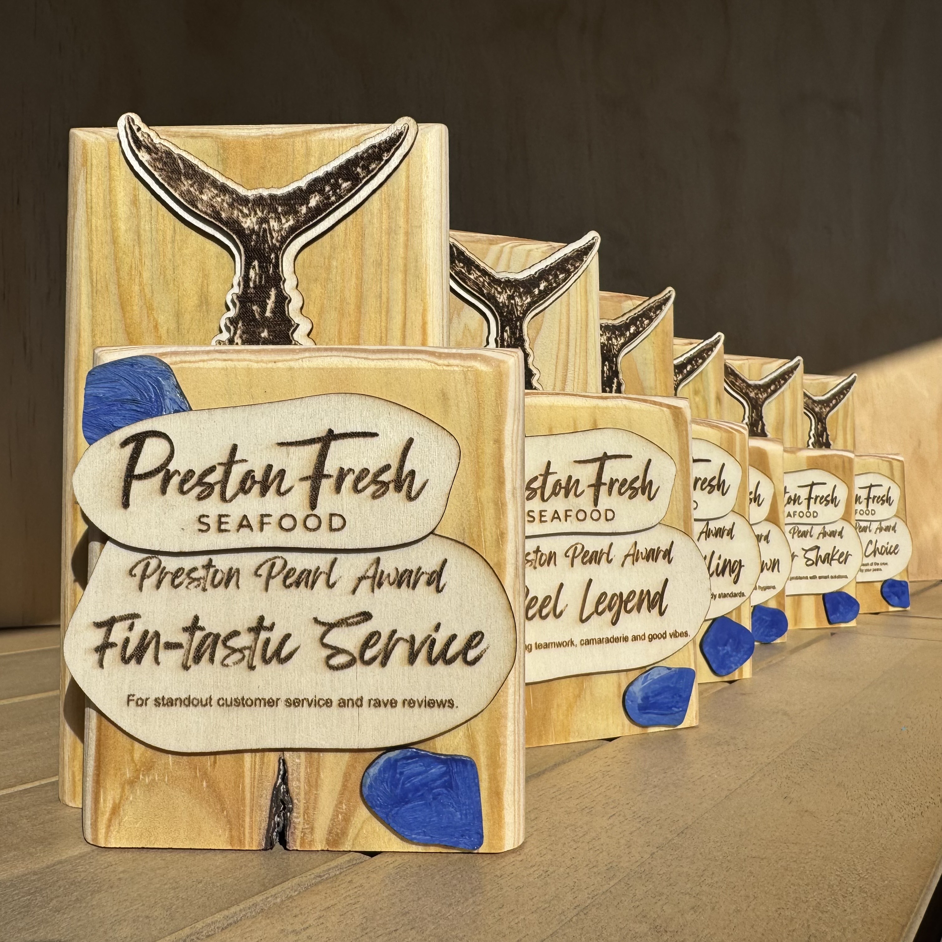 Preston Fresh Seafood Awards. Series of bespoke timber awards recognising excellence at Preston Fresh Seafood.