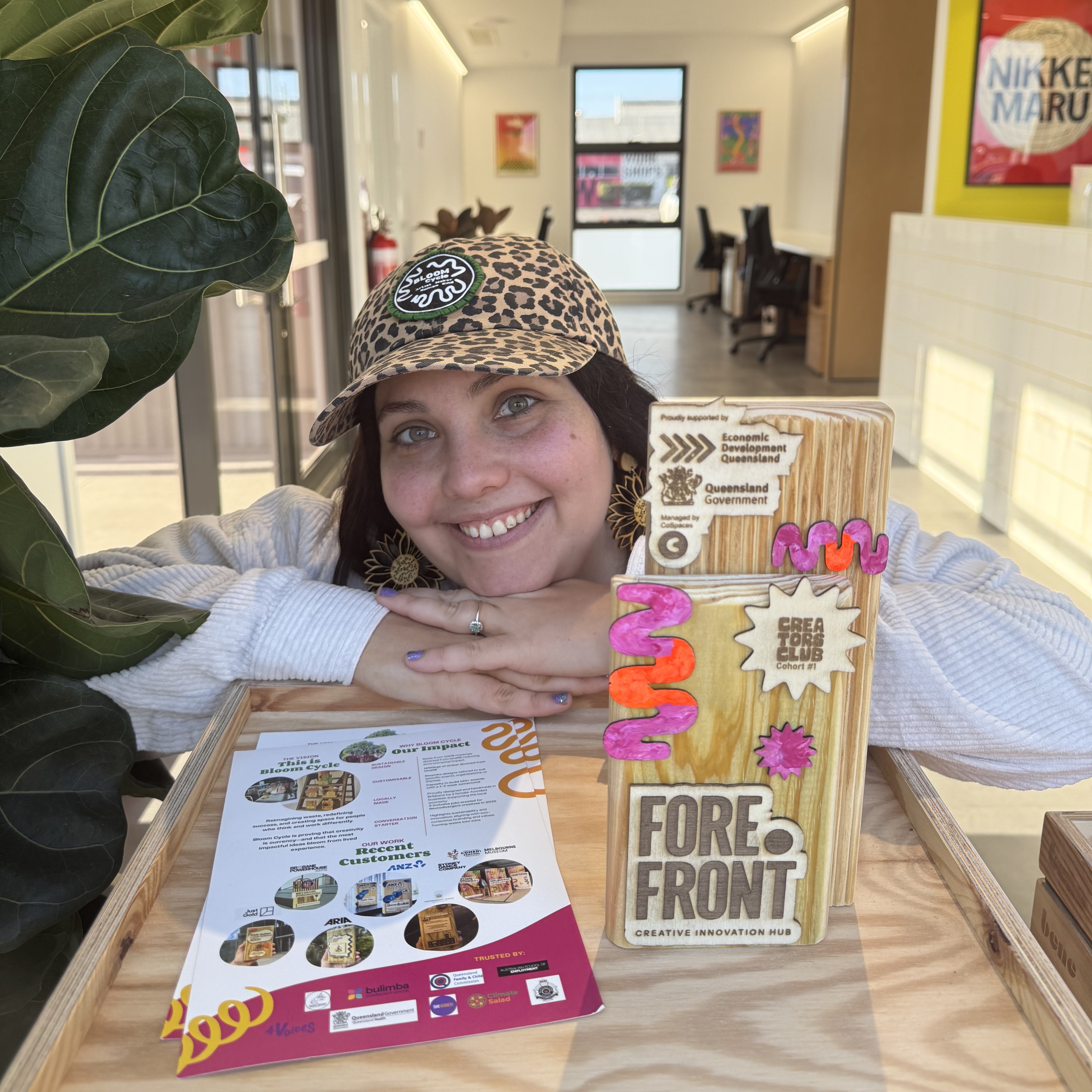 Zoe with Forefront Award. Founder Zoe with handcrafted timber award for Forefront Creators Club.